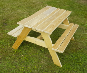 Det finns en variant på den klassiska bord med två fasta bänkar, där man har delat bordet i två och gjort bitarna fällbara så man kan dela det till två bänkar med ryggstöd istället.