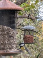 Vi har våra fröhållare nära några täta buskar så småttingarna flyr in där när rovfåglarna kommer.