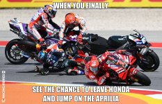 Är säkert sant men om det skulle vara en orsak med ett ursäktande, då kan man alltid ta upp Quartararo i jämförelse: Han kör inte över folk bara för att hans material inte är vasst nog.Crafars analys som jag förstod det är att han försöker kompensera för Hondas bristande prestanda.