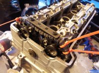 Vi monterade toppen och drog åt bultarna i toppen med 83 nm, och sen vara det bara att trixa i kamaxlarna. Kamaxlarna kom på plats relativt enkelt, och det går säkert med lite tjockare packning men 0,075" är väldigt nära den gränsen.